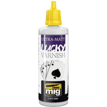 Protect your wargaming miniatures with Ammo by Mig's MIG-2050 Ultra-Matte Lucky Varnish. This 60ml varnish provides a protective, durable coating that dries to an ultra-matte finish, ensuring your game pieces have a realistic look without unwanted shine.