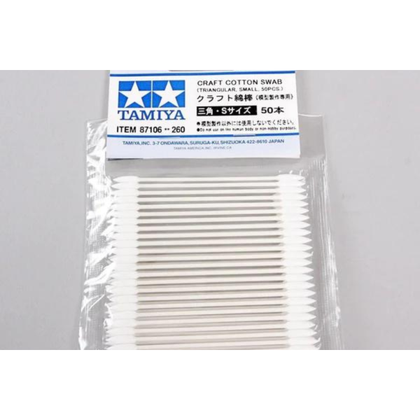 The Tamiya Craft Cotton Swabs are industrial strength swabs designed for modelers. With two round and three triangular shaped tips, these swabs are versatile and durable. Compared to those found in supermarkets, these swabs do not fray as easily when wet or dipped in solvents, resulting in less wastage. They are great for applying decals, panel lining, creating fine details, weathering, and more.