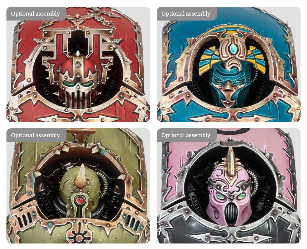 The Defiler has enough build options to impress even the most jaded Warpsmith. It has two torso pose options, three carapace options, two interchangeable chest plates, four regular Chaos Space Marine heads, one head each for the Iron Warriors, Word Bearers, World Eaters, Thousand Sons, Emperor's Children, and Death Guard, and two options each for the left and right shoulders. That means that no two of your devastating walkers need to look the same.
