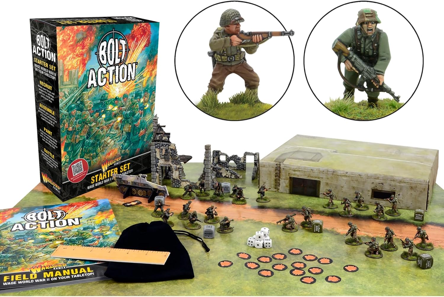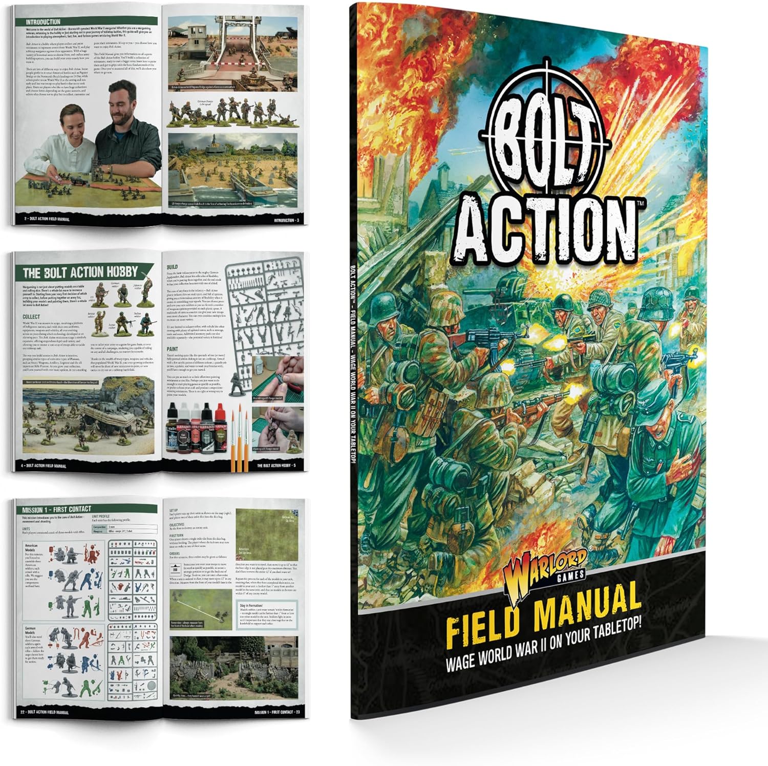 - Bolt Action Introductory Set contains: Full colour, 68 page book The Bolt Action Field Manual which guides you through collecting, building, painting and first steps of playing Bolt action