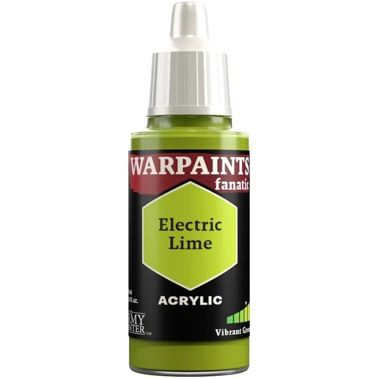 The Army Painter's Fanatic Electric Lime, a vibrant addition to your painting supplies. This acrylic paint features a brilliant yellowish green, perfect as a highlight or mid-tone. With its smooth application and exceptional coverage, Electric Lime adheres effortlessly to plastic, metal, and resin surfaces, ensuring professional-quality results every time. Achieve a matte finish for enhanced realism and versatility in your creations. Explore your painting skills with this versatile paint, compatible with various techniques including layering, dry brushing, and highlighting.